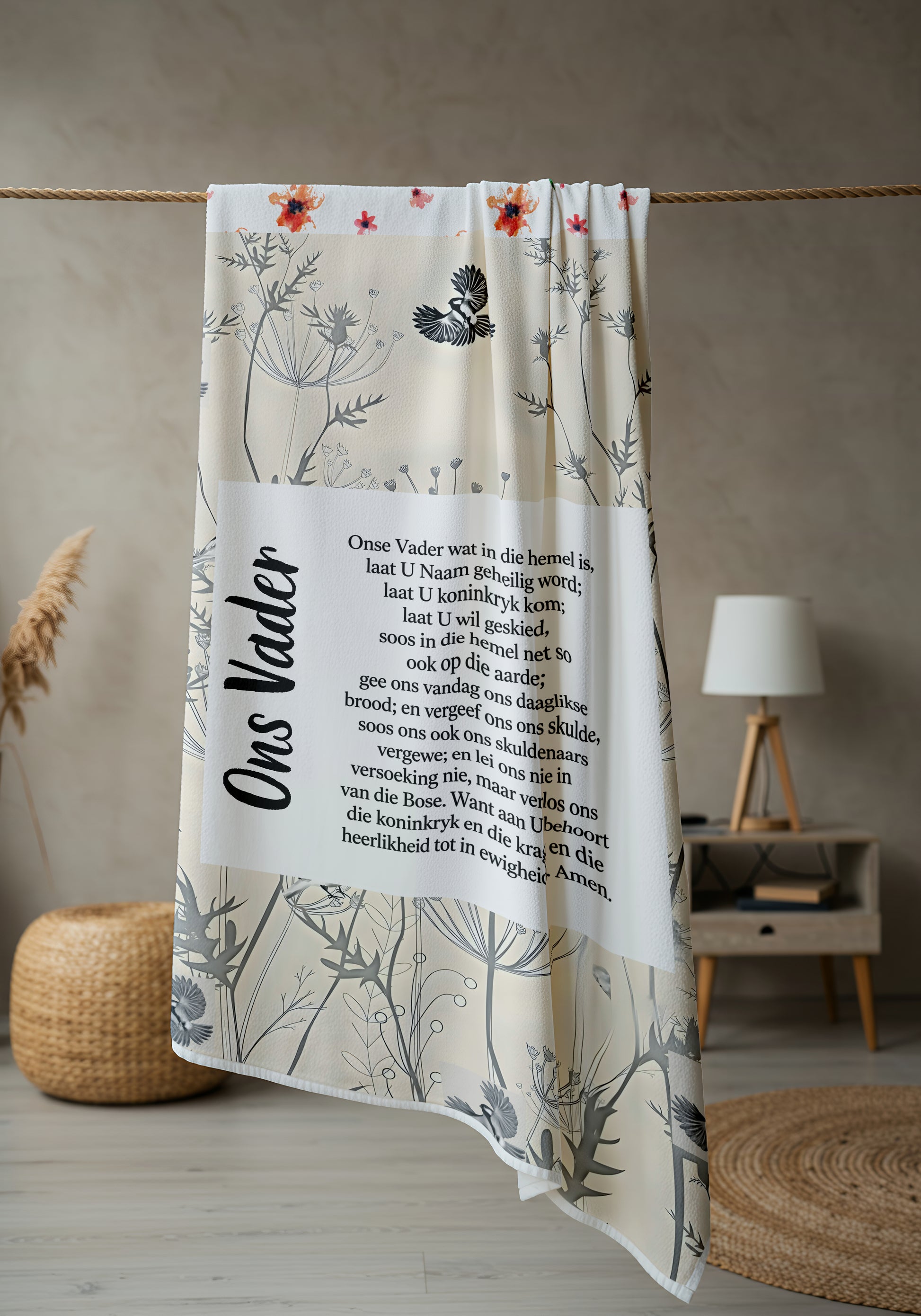 This Faith Blanket features the timeless words of The Lord’s Prayer, beautifully displayed in a calm, neutral design. The gentle beige background and subtle floral detailing bring a peaceful and reverent tone, making it a meaningful addition to any home.